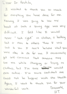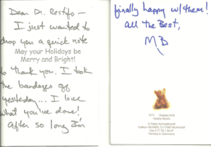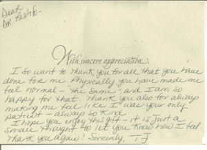 I so want to thank you for all that you have done for me. Physically, you have made me feel normal-‘the same’, and I am so happy for that. Thank you also for always making me feel like I was your only patient-always so kind. I hope you enjoy this gift-it is just a small thought to let you know how I feel. Thank you again! Sincerely.
