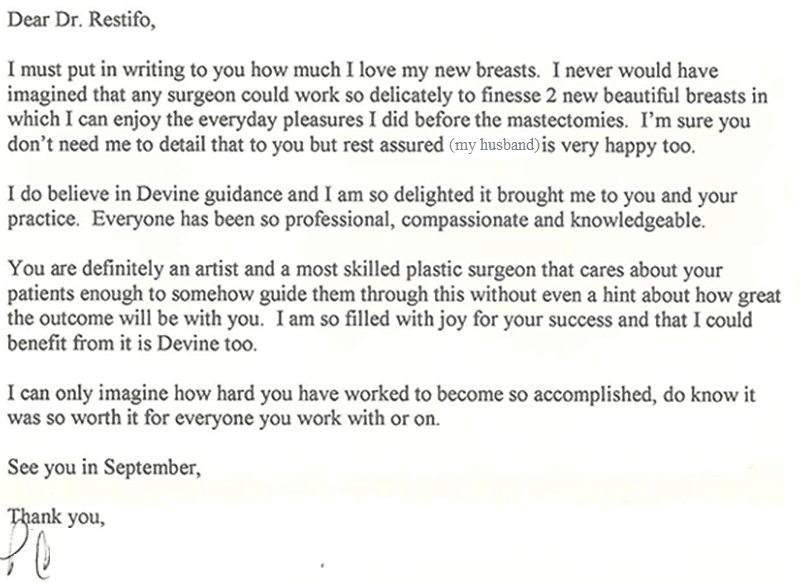 Thank you for the outstanding work you performed on me. Your superlative surgical skills are incredible and I am intoxicated with the results. I am so pleased to have met you! Although we spoke just a few times, your charm, brilliance, and indescribable confidence and trust quickly came across. You really are one in a million. Best wishes for continued success, happiness, and all good things. Warmest regards.